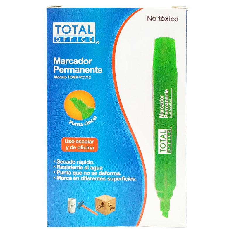 Marcador Permanente Verde Total Office, cuenta con una punta tipo cincel que te permite mayor precisión en los trazos, esta hecho a base alcohol y es un producto no tóxico.